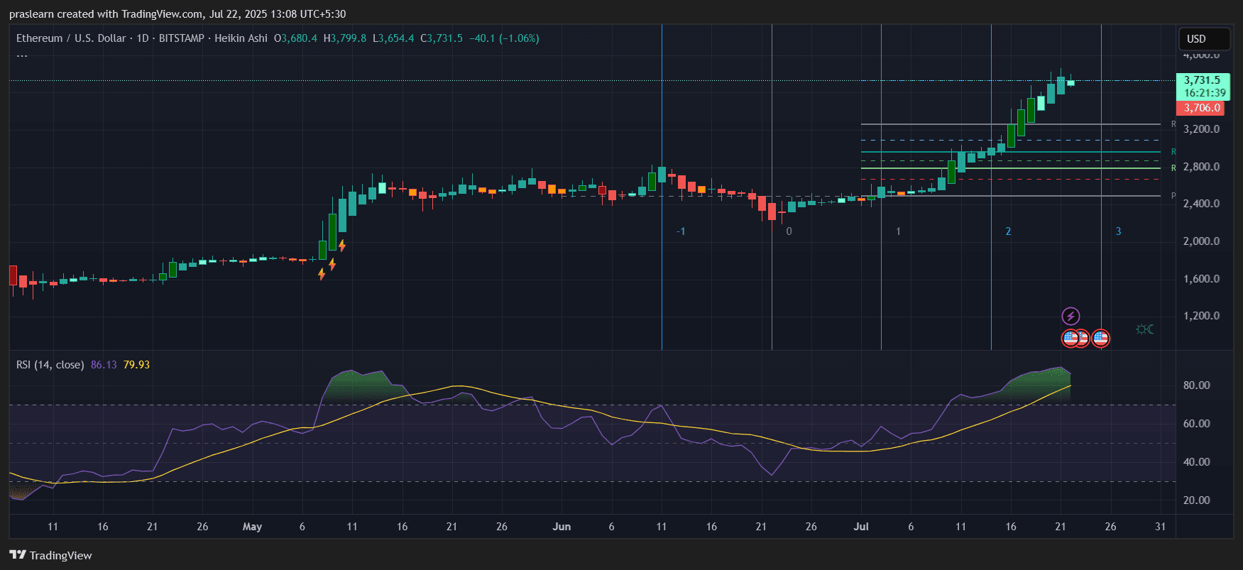 当前行情显示ETH徘徊在3,731美元附近,市场全面看涨情绪强烈。相对强弱指数(RSI)深陷超买区域,且Heikin Ashi图表呈现连续高位收盘蜡烛,核心问题浮出水面——以太坊本周能否突破4,000美元大关?还是即将迎来回调?让我们深入图表分析后市走势。