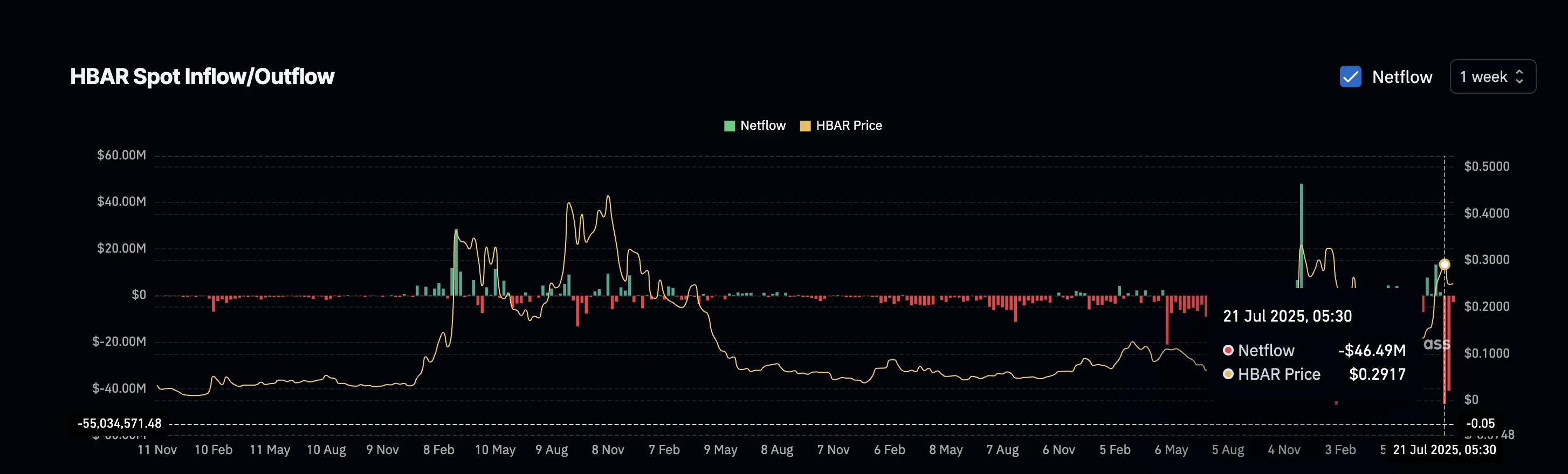 链上数据显示,HBAR已连续两周呈现强劲净流出:-4649万美元和-4085万美元。这种交易所代币持续撤离的现象通常被视为看涨信号,表明投资者信心增强且短期抛压降低。