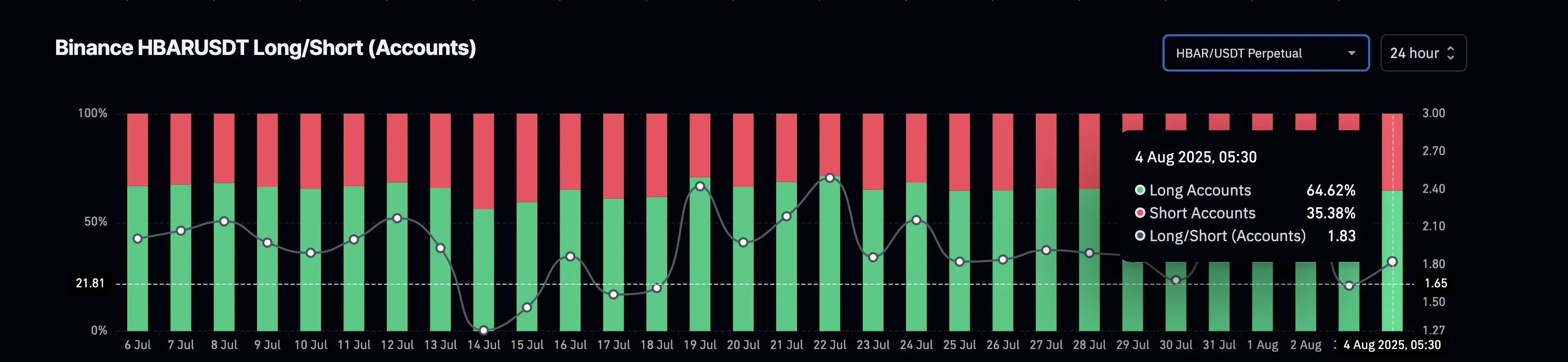 币安多空账户比数据佐证了这一趋势,当前数值接近1.83,意味着近三分之二的HBAR交易账户持多头仓位。与追踪交易量的多空比不同,该指标直接反映看涨交易者数量。结合稳定的资金外流与高多头占比,市场结构中的看涨暗流得到验证。