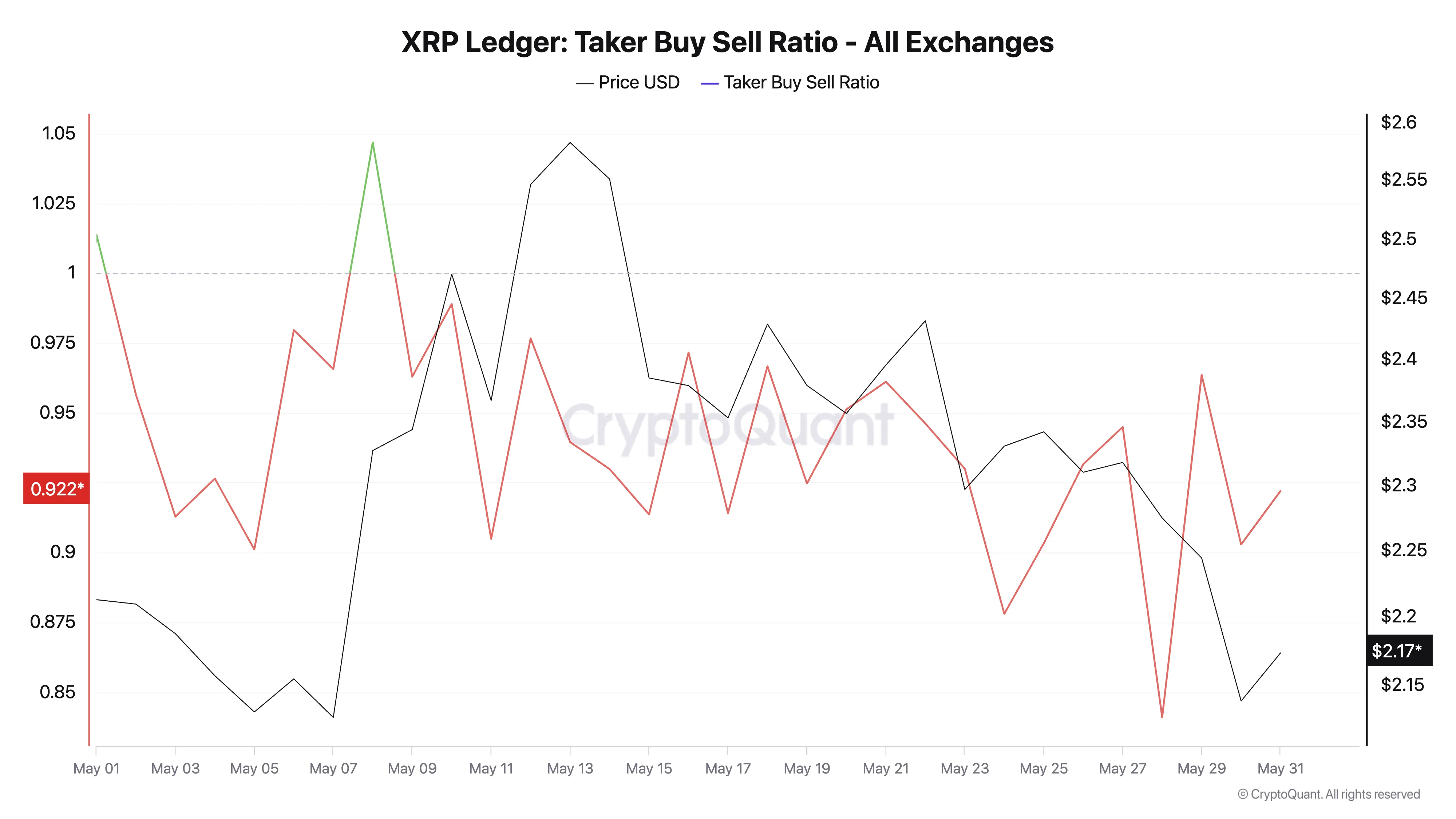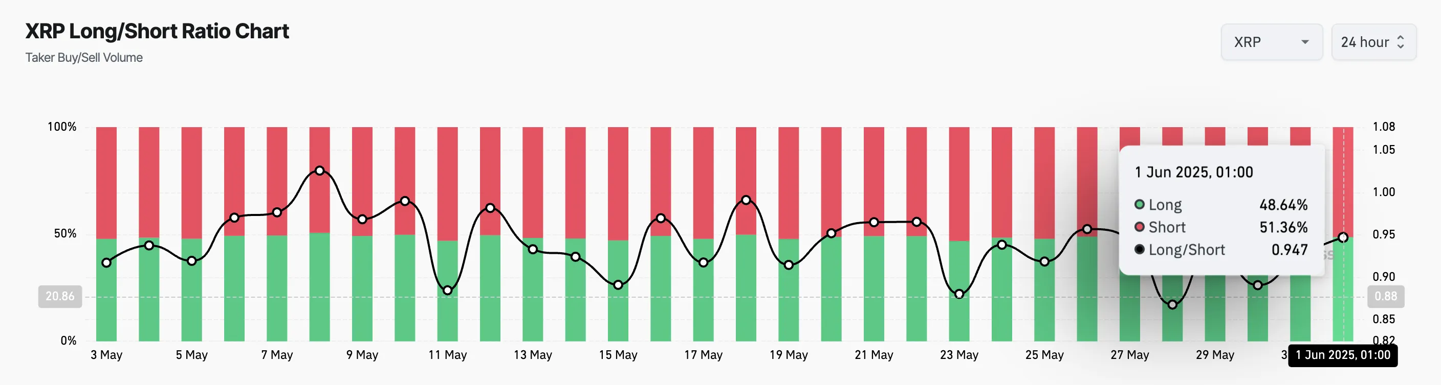 过去数周XRP买盘/卖盘比率的持续走低,显示期货交易者正在加速抛售。当前多空比率仅为0.94,且自5月8日以来始终低于1,意味着交易者近一个月来持续布局空头仓位。
