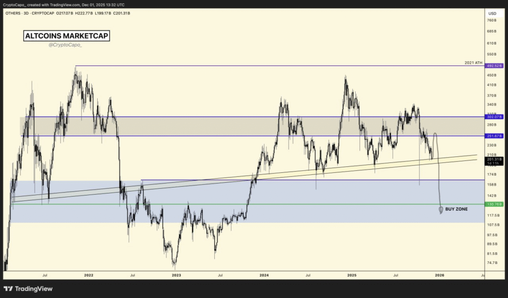 分析还显示市值多次未能突破3020亿美元阻力位,该阻力现已形成山寨币复苏的天花板。鉴于阻力位依然稳固,CryptoCapo预测市场将进一步回调至1300-1400亿美元支撑区间,该区域被称作“买入区间”。