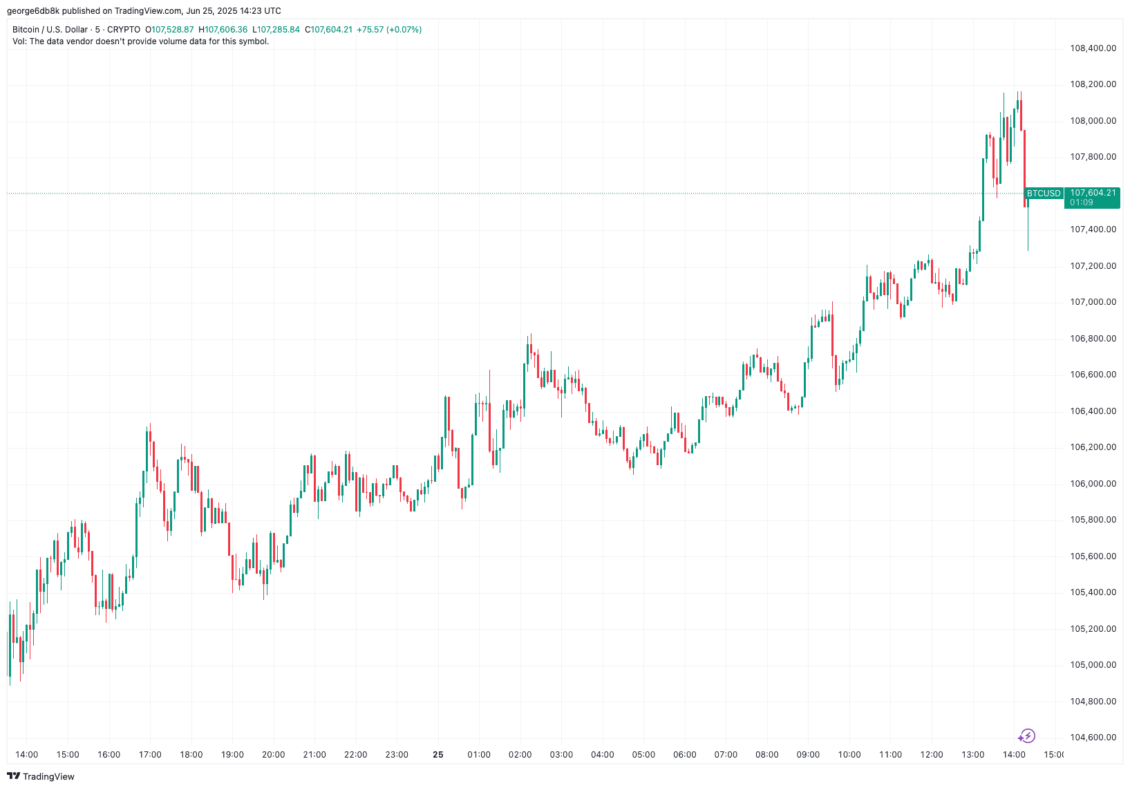 比特币价格24小时内上涨2.8%,短暂触及108000美元