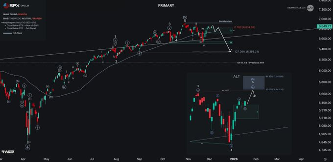 SPX虽创出新高,但后续形态引发市场关注。Trigger Trades指出近期震荡结构类似三角形,通常出现在A-B-C序列的最后阶段。该形态暗示动能放缓,而非新一轮上涨的早期阶段。