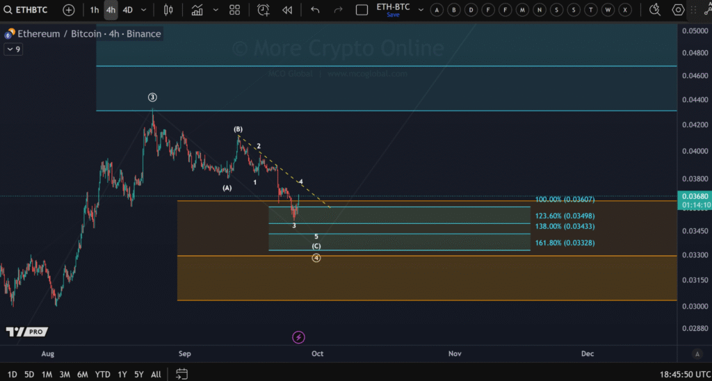 以太坊价格目前正对ETH/BTC图表上0.0336至0.0319的关键目标区间作出反应。基于币安4小时周期的分析显示清晰的艾略特波浪结构,突出呈现了(A)浪和(B)浪形态。该形态表明以太坊正接近关键转折点,后续价格走势或将决定其对比特币的下跌趋势是延续还是反转。