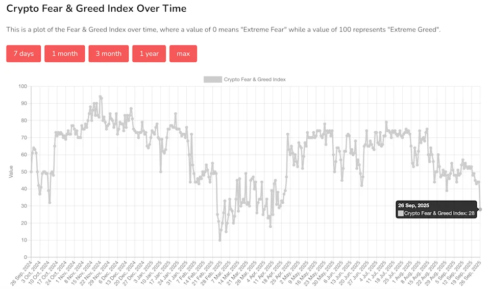加密货币市场整体情绪明显转向恐惧,周五恐惧与贪婪指数跌至28点,创下四月中旬以来新低。这反映出交易者对市场走势的担忧加剧。