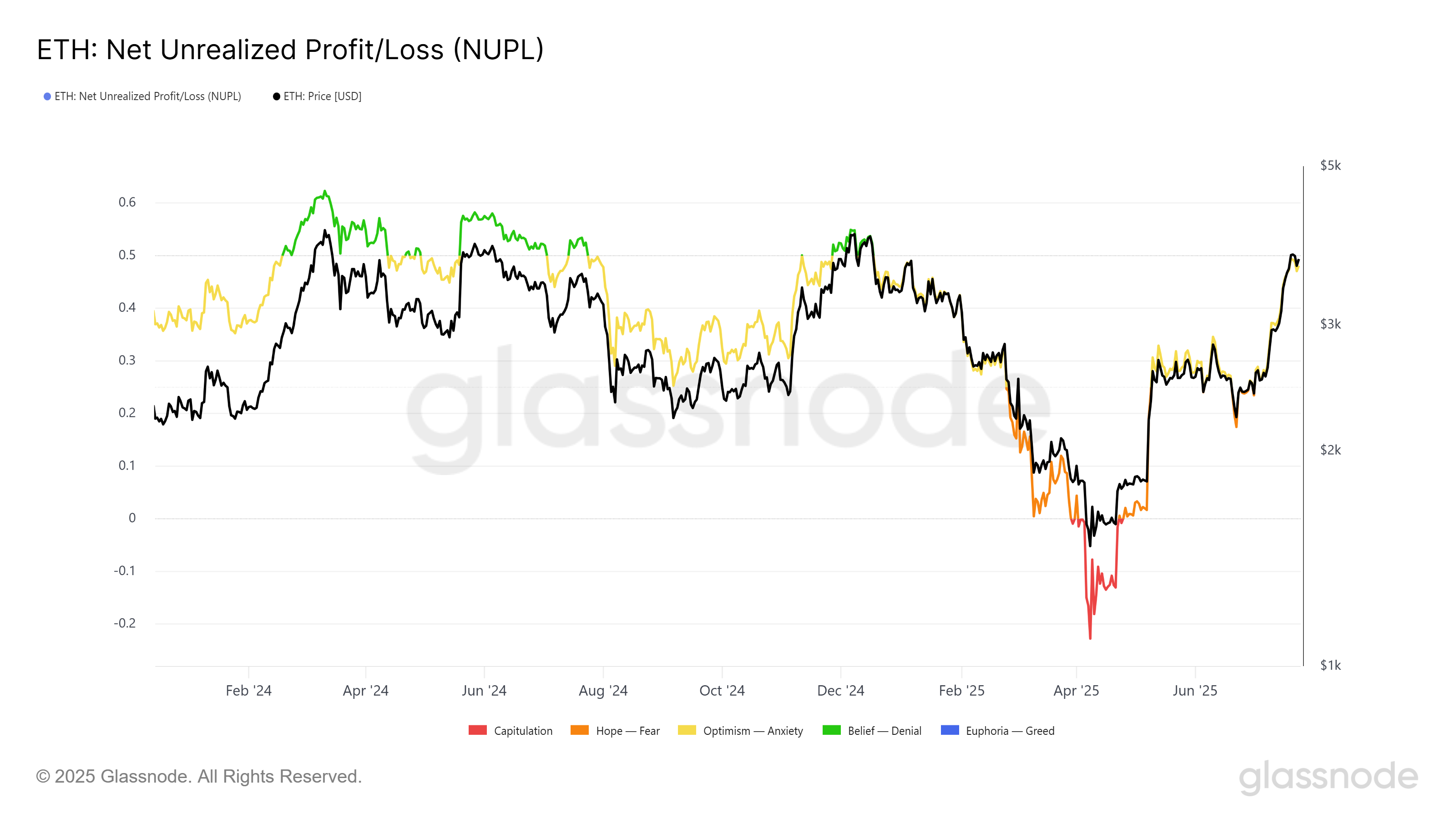 从更宏观的技术指标来看,NUPL(未实现净盈亏)指标显示以太坊即将迎来重大上涨。历史数据显示,当NUPL指标触及0.5阈值时,往往预示上涨趋势暂停后将出现急剧拉升。当前指标正逼近该阈值,而过去这种情况往往标志着强劲上涨行情的开端。随着NUPL指标持续上升,这为以太坊下一轮价格上涨提供了坚实的历史依据。