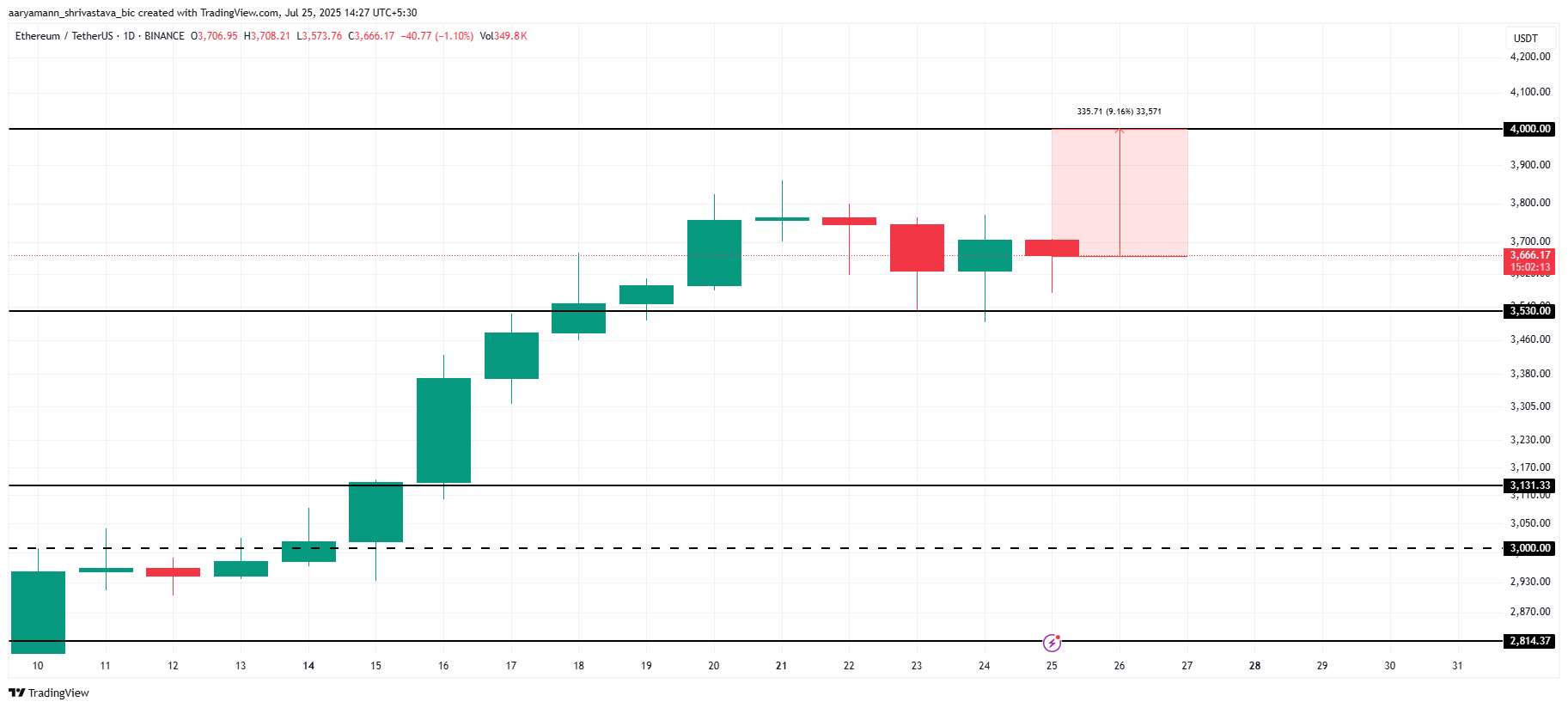 以太坊现报3666美元,距离关键阻力位4000美元仅差9%,这是过去七个月来众多投资者翘首以盼的关口。尽管近期出现盘整,但这款主流山寨币有望延续上涨势头,可能很快突破4000美元大关。