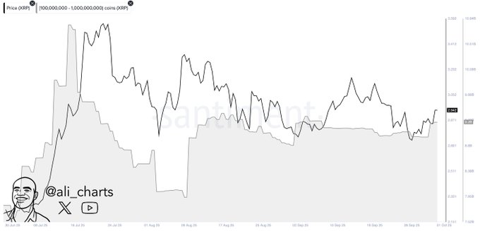 据Ali(@ali_charts)数据,持有1000万至10亿XRP的鲸鱼钱包在48小时内累计增持约2.5亿枚代币。这种急剧的资金流入反映了大户的精准布局,他们持续影响着XRP的短期市场行为。