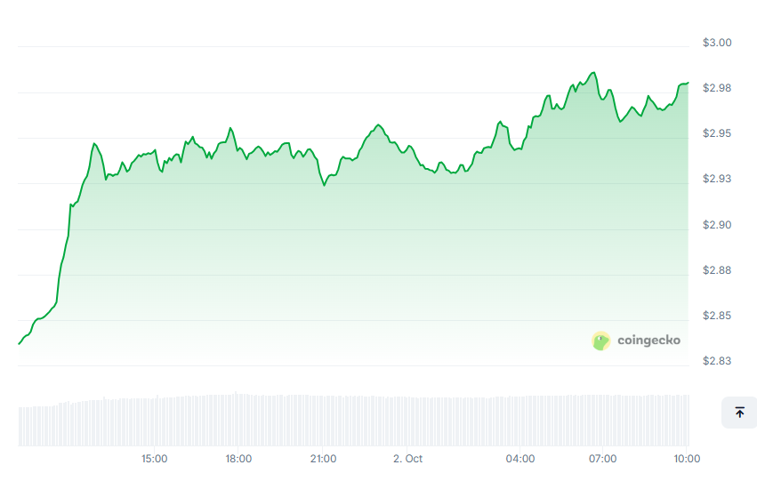 XRP在24小时内上涨5.1%,流动性强劲下试探3美元关口。市场结构显示更高低点正在形成,交易量与鲸鱼活动共同提供支撑。