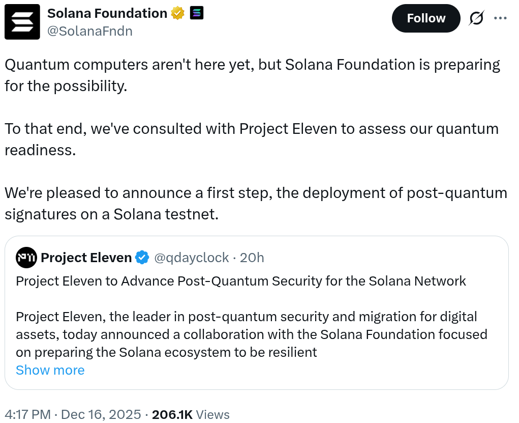 Solana基金会宣布与后量子加密安全公司Project Eleven建立合作伙伴关系,旨在为Solana应对量子计算崛起做好技术准备。