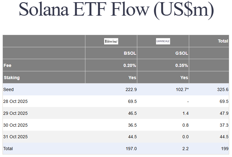 尽管10月最后一周加密市场整体走低,Solana ETF却成为当周最大亮点。灰度与Bitwise在10月末相继推出首批现货Solana ETF,更因首创质押功能引发市场热潮。这两支ETF上线不足四天便实现1.99亿美元资金流入。