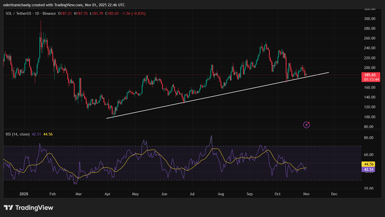 尽管ETF资金流入强劲,但未能扭转市场颓势。SOL价格在观测期间报185美元,较当周205美元高点回落13%,再次测试自4月以来形成的上升支撑线。