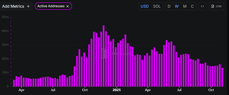 链上数据同样显示隐忧:过去7日活跃地址数降至1350万,创12个月新低。不过自10月27日以来,Solana网络净流入仍保持2.37亿美元高位,DEX交易量亦小幅回升。