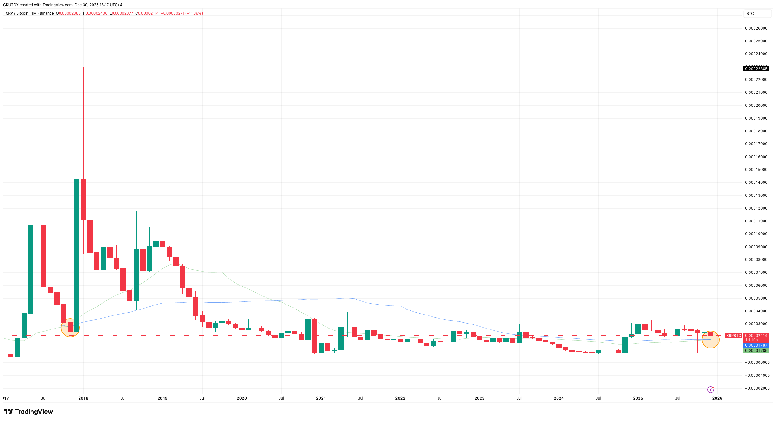 若交叉信号得到确认且汇率开始逼近2018年阻力位,市场逻辑将转变为XRP无需依赖比特币下跌即可走强。只需维持相对需求优势,上行空间将快速放大。但需注意月线信号本身具有滞后性,验证信号真伪比盲目追涨更为重要。若XRP/BTC能稳守近期阻力上方,伴随成交量放大有望构筑更高低点;若突破失败,汇率可能回落至0.00002区域,这将使得黄金交叉沦为虚假信号。