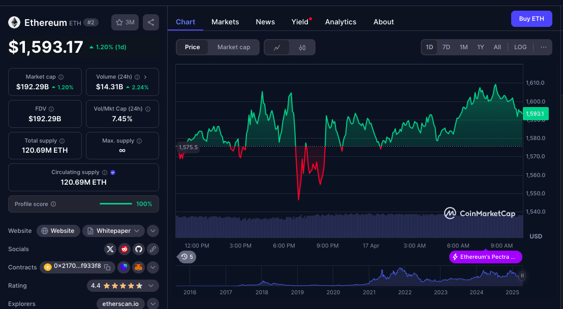 截至撰写本文时,以太坊交易价格为1,593美元,过去24小时上涨1.20%。这一价格走势伴随着日内交易量7%的增长,显示出市场的谨慎乐观情绪。然而,尽管有小幅上涨,ETH仍比其历史高点4,891美元低67%。