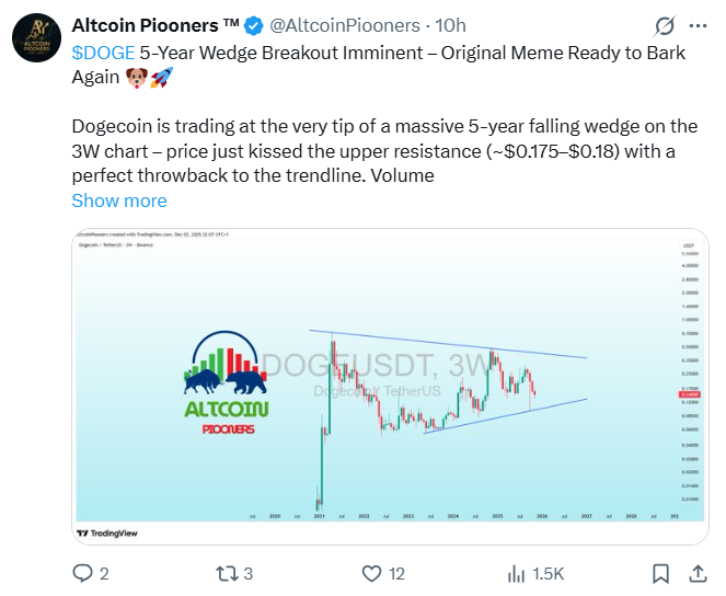 Altcoin Pioneers强调的关键看涨信号是始于2020年的楔形突破形态。该交易员指出,在三周图表上,DOGE价格正处于持续五年的巨大下降楔形末端。近期价格曾触及0.175-0.18美元的上方阻力线,随后完美回测下方趋势线。这种经典突破形态可能推动DOGE迎来更强劲上涨。截至发稿,DOGE交易价约0.15美元,过去24小时上涨9.9%。
