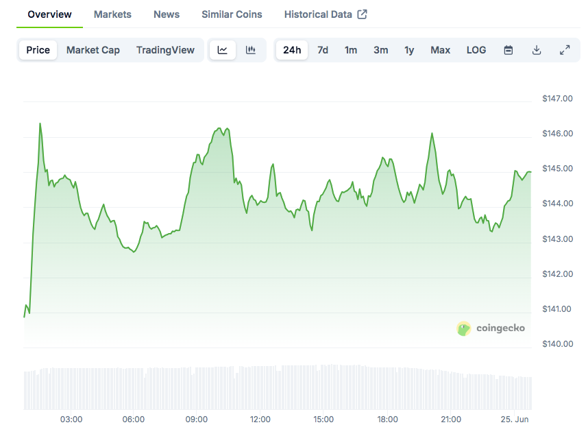 截至撰稿时,SOL交易价格为144.90美元,24小时上涨2.86%,但周线仍下跌2.53%,显示短期波动性。24小时交易量达53.9亿美元,表明市场兴趣正在升温。