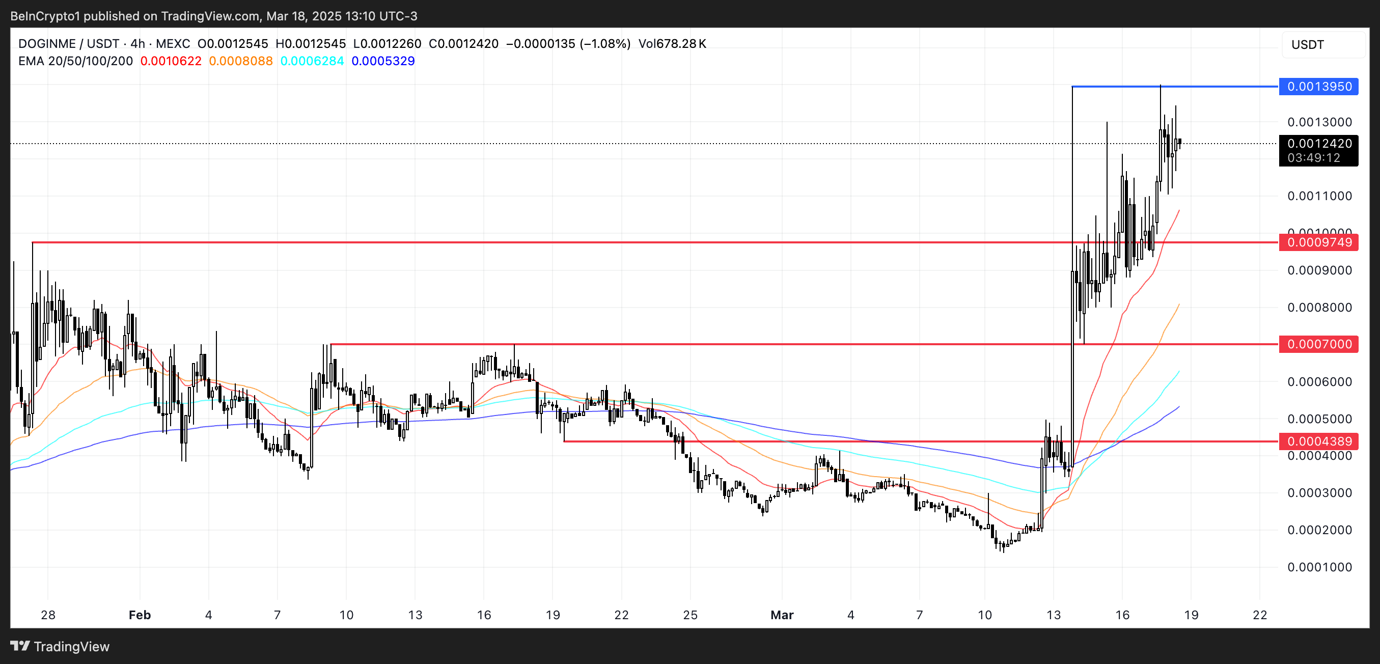 如果上涨趋势持续,DOGINME可能突破0.00139美元,并有望向0.0015美元和0.0020美元迈进。然而,如果动能减弱,价格可能回调至0.00097美元、0.0007美元甚至0.00043美元。