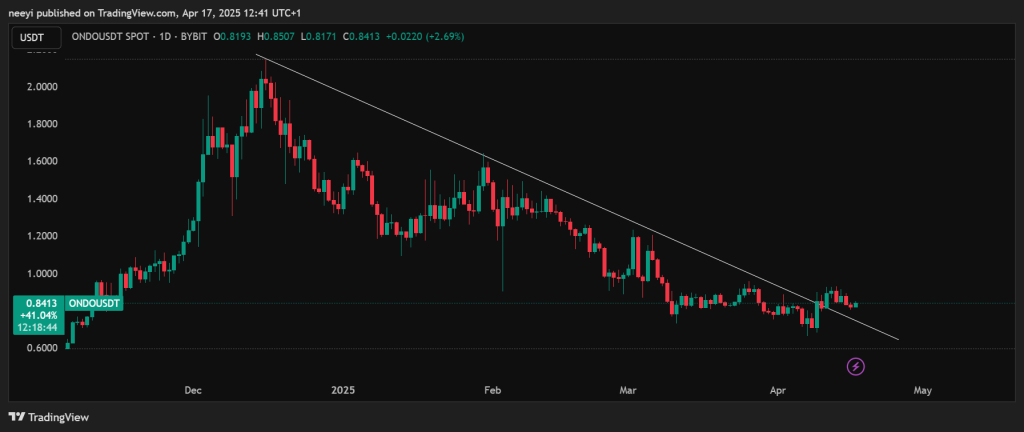 今年4月初,ONDO终于突破了自去年12月以来一直压制其价格上涨的长期下降趋势线。4月9日左右的突破引发了市场对反弹的期望,但截至目前,价格仍维持在0.80至0.92美元之间的横向区间内。