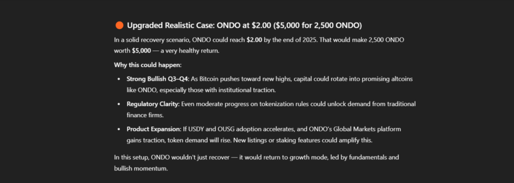 这一情景假设比特币在下半年开始获得动力,资金流入有前途的替代币如ONDO。监管明确性可能为更深入的机构参与打开大门,如果ONDO的代币化资产(尤其是USDY和OUSG)的采用加速,代币需求也可能随之上升。