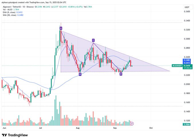 分析师Alpha Crypto Signal(@alphacryptosign)指出,Algorand正在水平支撑位与下降趋势线之间盘整。图表显示0.23-0.24美元形成扁平基底,而逐渐下移的高点持续压缩价格波动空间。这种典型的下降三角形结构通常倾向于看跌。