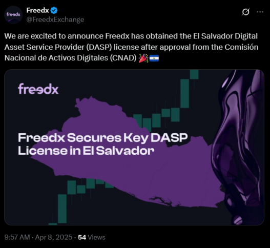 Freedx Secures DASP License in El Salvador | Source:x.com/FreedxExchange