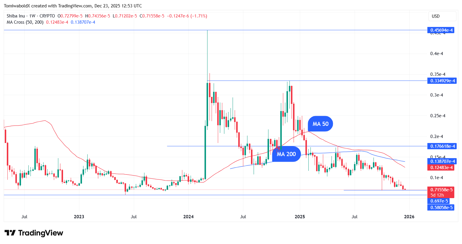 另一方面,若市场出现强劲买盘催化剂,柴犬币可能迎来反弹。若能重新站上0.00001277美元的50周均线和0.00001386美元的200周均线,则有望巩固复苏势头,再次上攻0.00003344美元目标位。