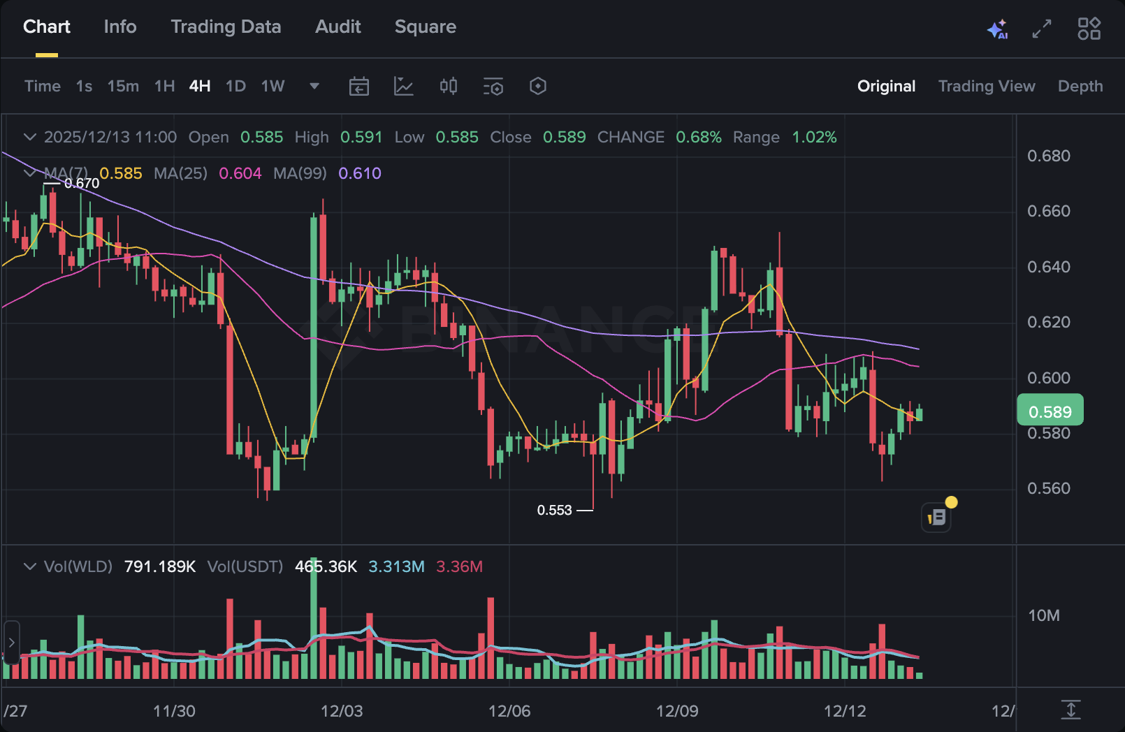 Worldcoin(WLD)在过去24小时内呈现剧烈波动,持续吸引市场关注。最新价格数据显示,WLD在此期间出现小幅下跌,当前价格徘徊在0.58美元附近,24小时交易量约为9000万美元。CoinMarketCap和CoinGecko数据显示,WLD市值约为14亿美元,位列市值排行榜第49位。尽管保持着可观的流动性,该代币仍与历史高点相距甚远。