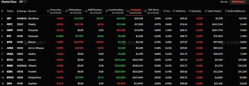 IBIT(BlackRock, NASDAQ)以1593万美元单日净流入领先,单日BTC流入量为181.47枚,累计净流入629.2亿美元,净资产规模683.3亿美元,单日交易额达21.9亿美元。