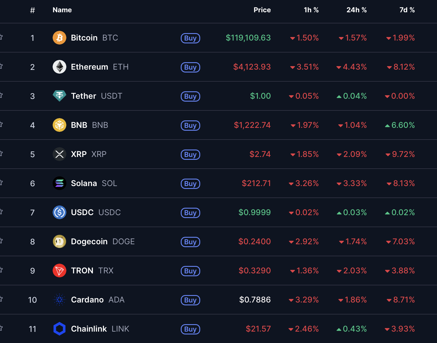 交易商担忧这可能演变为更大范围的经济对抗,导致全球流动性收紧,并削弱股市及数字资产领域的风险偏好。最新数据显示,比特币(BTC)下跌1.57%至119,109美元,以太坊(ETH)暴跌4.43%至4,123美元,周跌幅扩大至8%以上。
