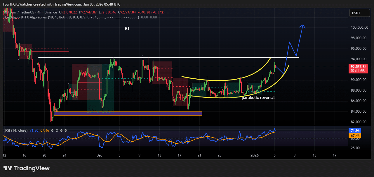 当前趋势表明多头掌握主导权,若动能得以延续,价格有望触及更高水平。若比特币能有效突破94,000美元,下一目标将遵循抛物线轨迹指向96,000-100,000美元区间。