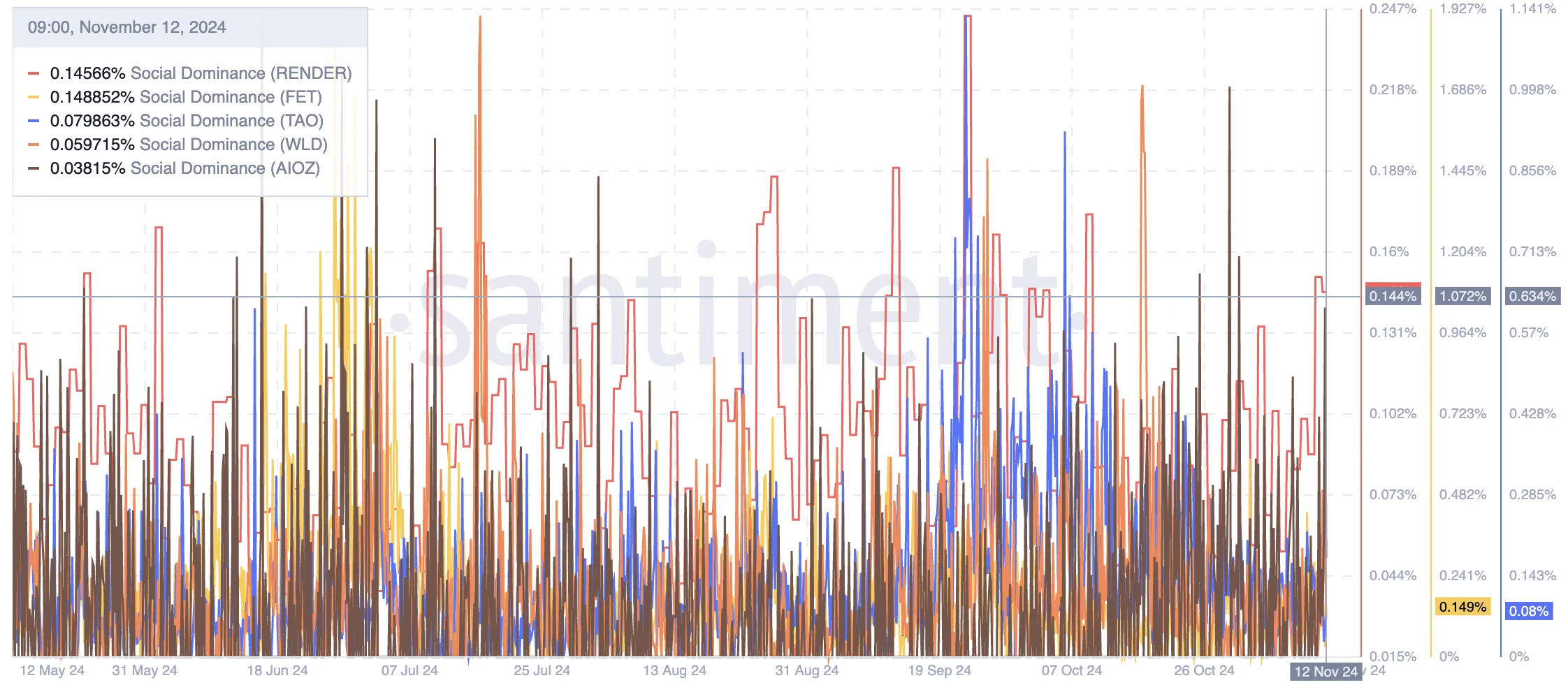 RNDR在五大人工智能代币中的社交主导地位已攀升至第二位,其社交媒体存在感在过去七天内几乎翻倍。社交活动的激增反映了市场对RNDR的关注度和讨论度正在提升,这很可能推动了其近期的价格表现。