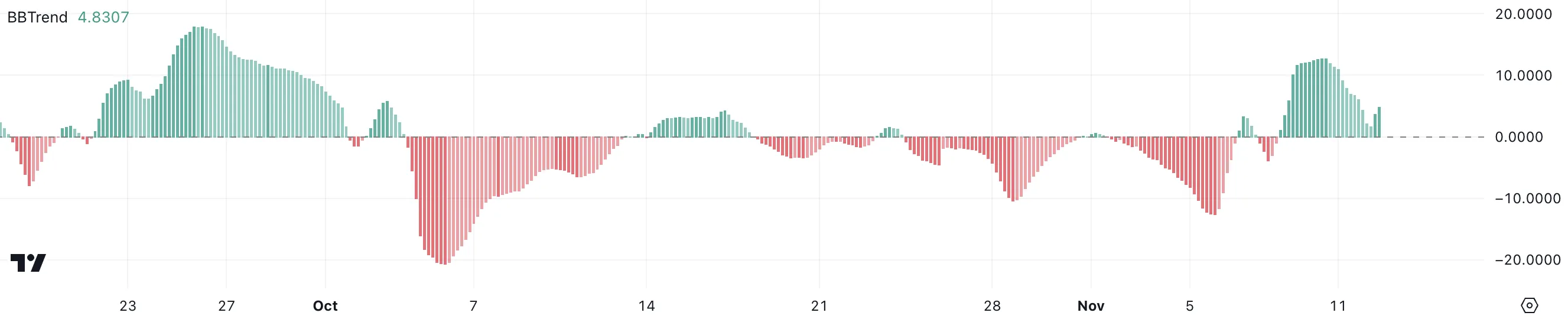自11月8日以来,BBTrend保持正值,并于11月10日达到月度高点12.7。BBTrend(BollingerTrend)是与布林带相关的动量指标。正值表明看涨动能正在推动资产价格,而负值则暗示看跌趋势。