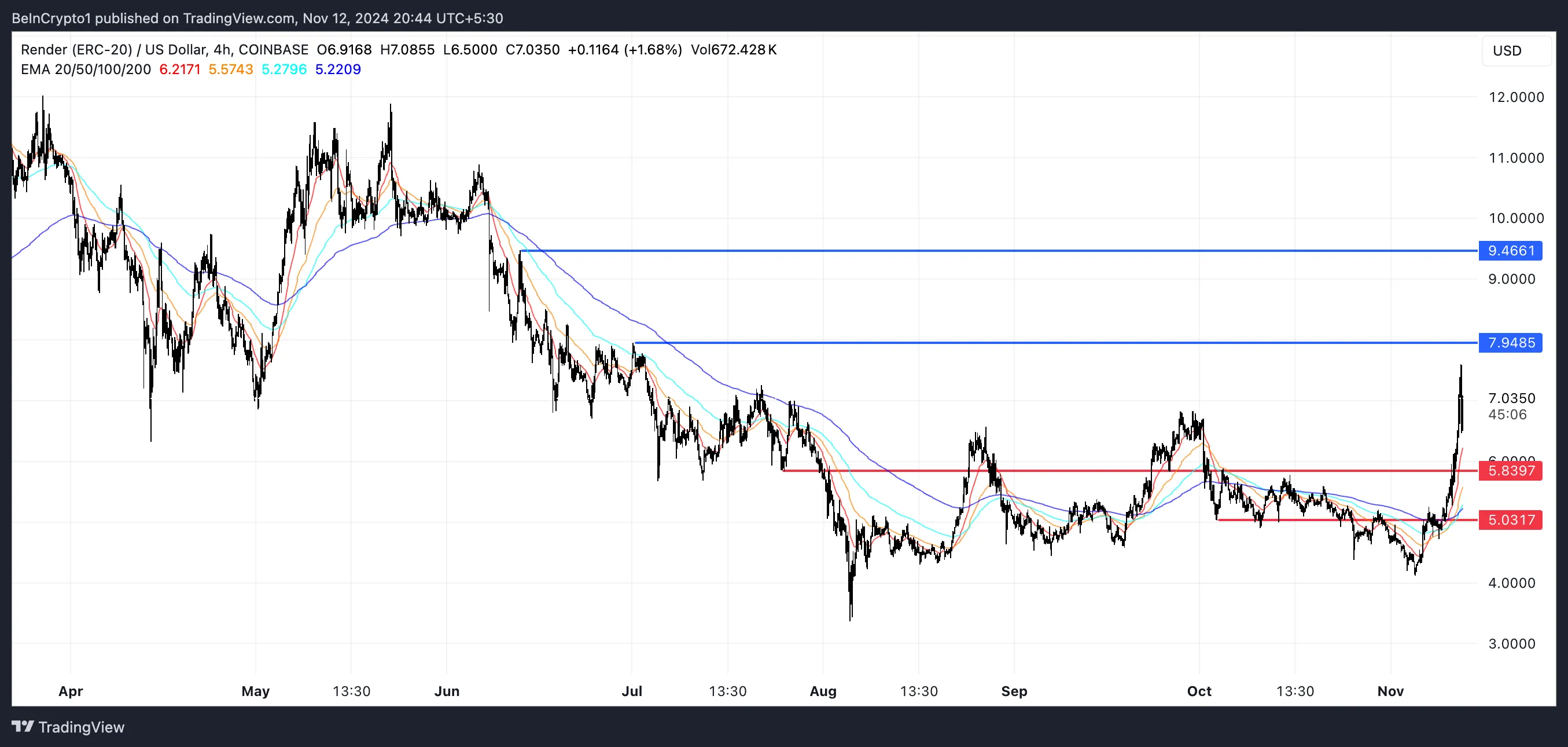 RNDR的EMA(指数移动平均线)显示出强烈的看涨情绪,目前价格位于所有EMA之上。此外,短期EMA位于长期EMA之上,这确认了当前动量是正向的,且买方占据主导地位。这种技术形态表明,如果市场环境保持支持性,上涨趋势可能会延续。