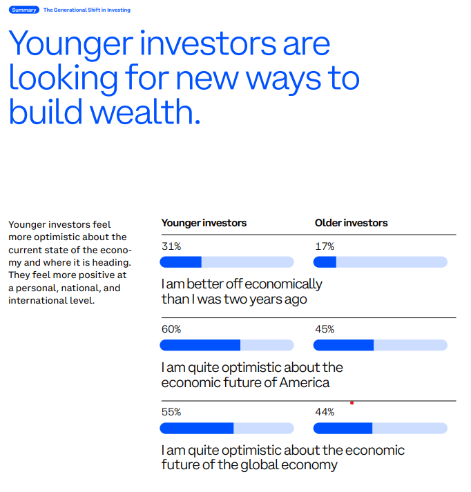 年轻投资者表示其持有的资产中有25%属于加密货币、衍生品和私募投资等非传统资产,是年长投资者(婴儿潮一代)8%配置比例的三倍之多。每五位年轻受访者中有四人表示愿意率先尝试新的投资机会,84%的人希望获得能提供传统股票之外更广泛资产的投资平台。