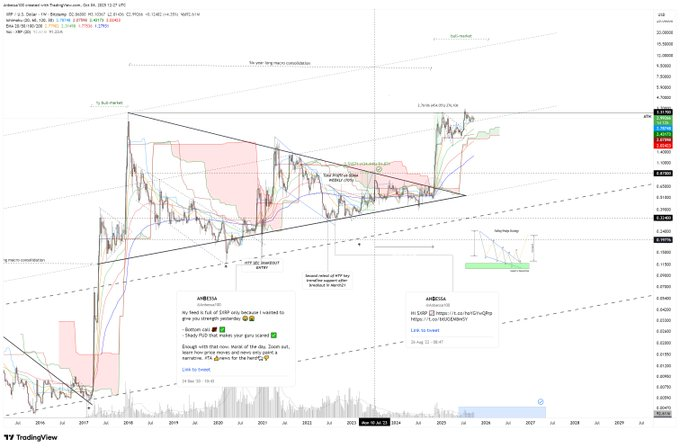 过去数年间,XRP价格始终遵循这些结构区域。通过在被收复的价位保持整固,该代币已发出牛市延续信号。这与ANBESSA所述"多年完美结构校准"的近期形态相吻合。