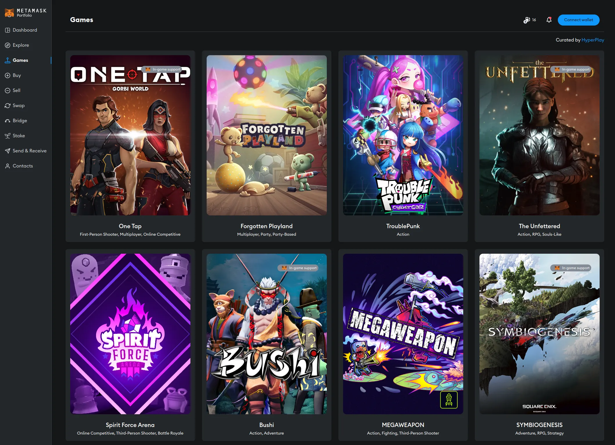 领先的以太坊钱包MetaMask通过与加密游戏商店HyperPlay的全新整合,现已能够直接从其MetaMask Portfolio界面启动游戏。这一合作在MetaMask Portfolio中建立了一个专门的游戏目录,该去中心化应用(dapp)允许用户管理钱包资产并与其他应用进行交互。这使得用户可以轻松访问并玩转通过HyperPlay提供的与MetaMask兼容的区块链游戏。