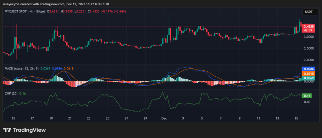截至发稿,MYX Finance在过去24小时上涨10.42%,交易价格约为3.43美元。该资产市值维持在8.5929亿美元。此外,MYX日交易量暴涨115.27%,达到8948万美元。