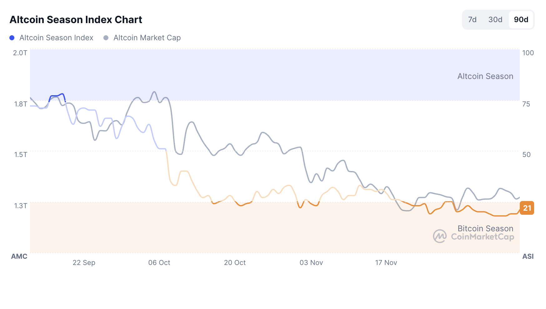 然而市场杠杆偏好仍然有限。未平仓合约仅增长1.14%,宏观经济指标与加密货币的关联信号也未提供明确方向。竞争币表现持续落后于比特币。CMC竞争币季节指数维持在22/100,表明市场仍处于“比特币季节”。比特币主导地位达58.55%,而以太坊以周涨幅6.49%的表现超越大型项目。