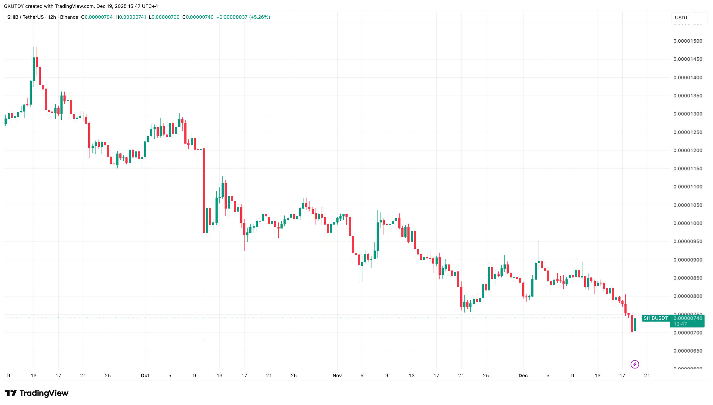 这只热门 meme 代币的5%涨幅在标题中看似亮眼,但在五分钟图表中则显脆弱。交易视图显示12月19日SHIB价格徘徊在0.00000739美元附近。同一时间段内,图表呈现冲高回落态势,价格一度下探0.000007美元区间,反弹至中轨后陷入横盘震荡。这种形态可能构成典型的多头陷阱:反弹真实存在,但持续动能不足。