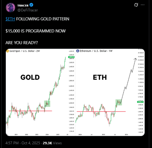 市场观察者将ETH的走势结构与黄金重大突破前的多年攀升进行类比。交易员DeFiTracer发布的图表显示,以太坊2024-2026年模式与黄金2020-2025年上涨轨迹高度吻合。他在X平台发文称,ETH可能正在"复刻黄金路径",15,000美元的目标位或已进入实现阶段。区块链记者数据佐证了这一观点:研究显示2025年第三季度以太坊与黄金相关性系数升至0.7,创下两类资产有记录以来的最强联动。