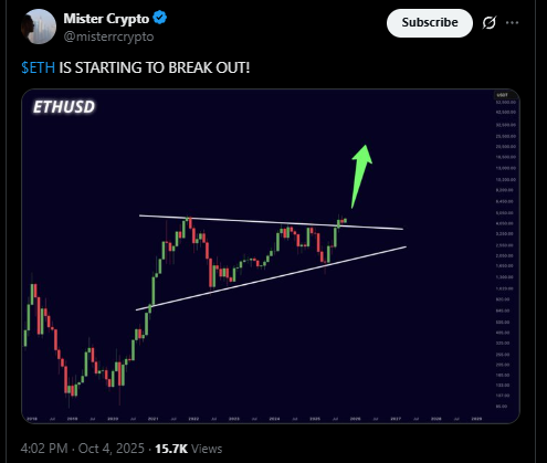 技术图表显示以太坊仍处强势阶段。分析师Mister Crypto指出,ETH/USD已突破自2021年4,900美元高点形成的下降阻力线,在2025年10月17%的涨幅助推下,确认突破形态为重新测试4,500美元阻力位奠定基础,本季度末或有望上探6,900美元。