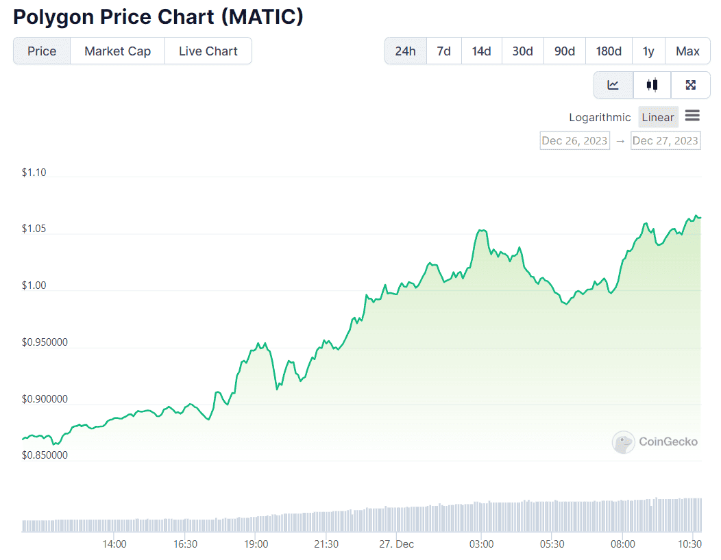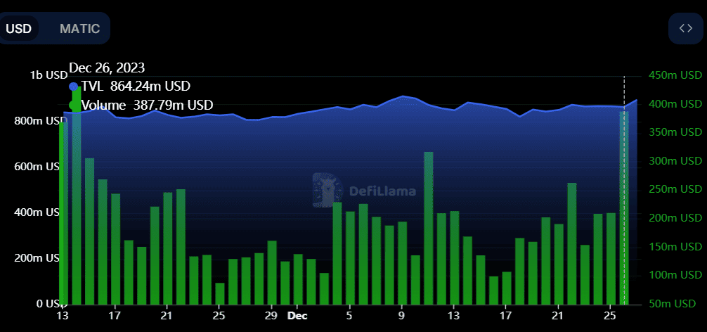 此外,Polygon的交易量最近激增。正如DefiLlama所揭示的,12月26日的交易量接近4亿美元,远高于自月中以来的1.5亿美元大关。