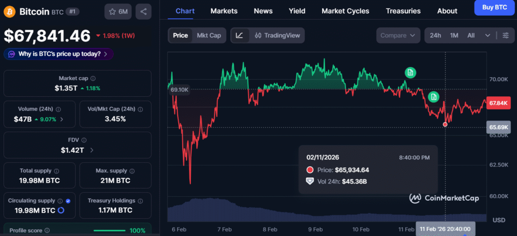 当日比特币交易价格曾跌破6.6万美元关口。截至撰稿时,比特币回升1.23%至67,841美元,但周跌幅仍达1.98%,月跌幅超过26%。