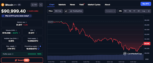 根据CoinMarketCap数据,比特币价格在过去24小时内下跌4.92%,报90,999.40美元,总市值缩水至1.81万亿美元。值得注意的是,交易量逆势增长46.37%,达到1155.5亿美元。