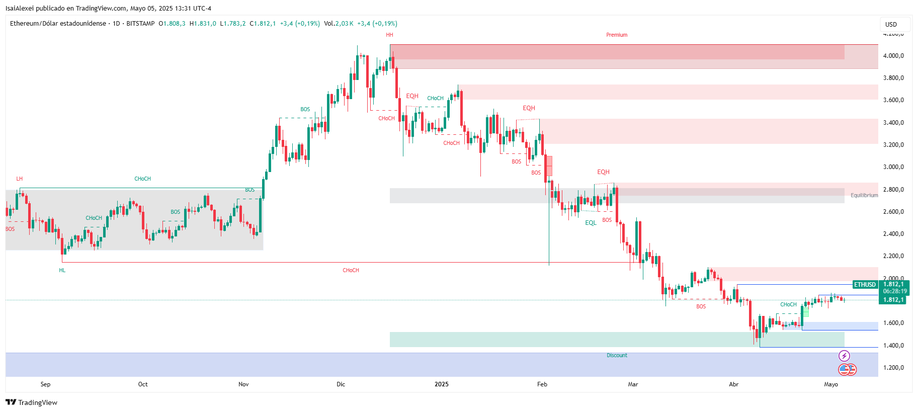 从技术上讲,ETH似乎在一个1,780美元至1,840美元的狭窄区间内交易,表明缺乏强劲的动量。市场参与者可能在等待更明确的宏观信号或以太坊网络更新——如协议升级或机构采用增加——以推动下一个决定性举措。