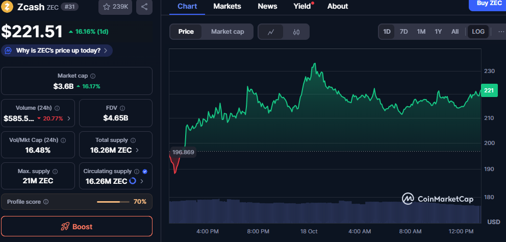 ZEC暴涨16.16%至221.51美元,稳居隐私币涨幅榜首