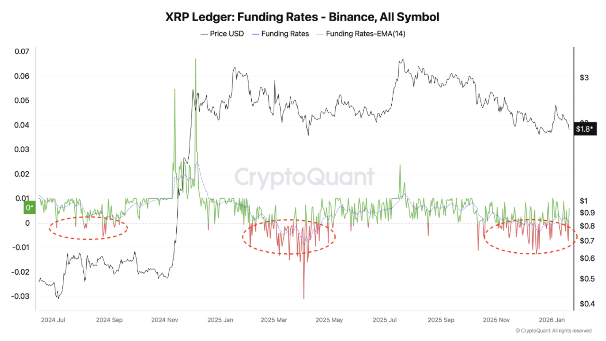 过去两个月币安资金费率多数时间维持负值,表明杠杆交易者普遍押注XRP下跌,并需持续支付费用以维持空头仓位。