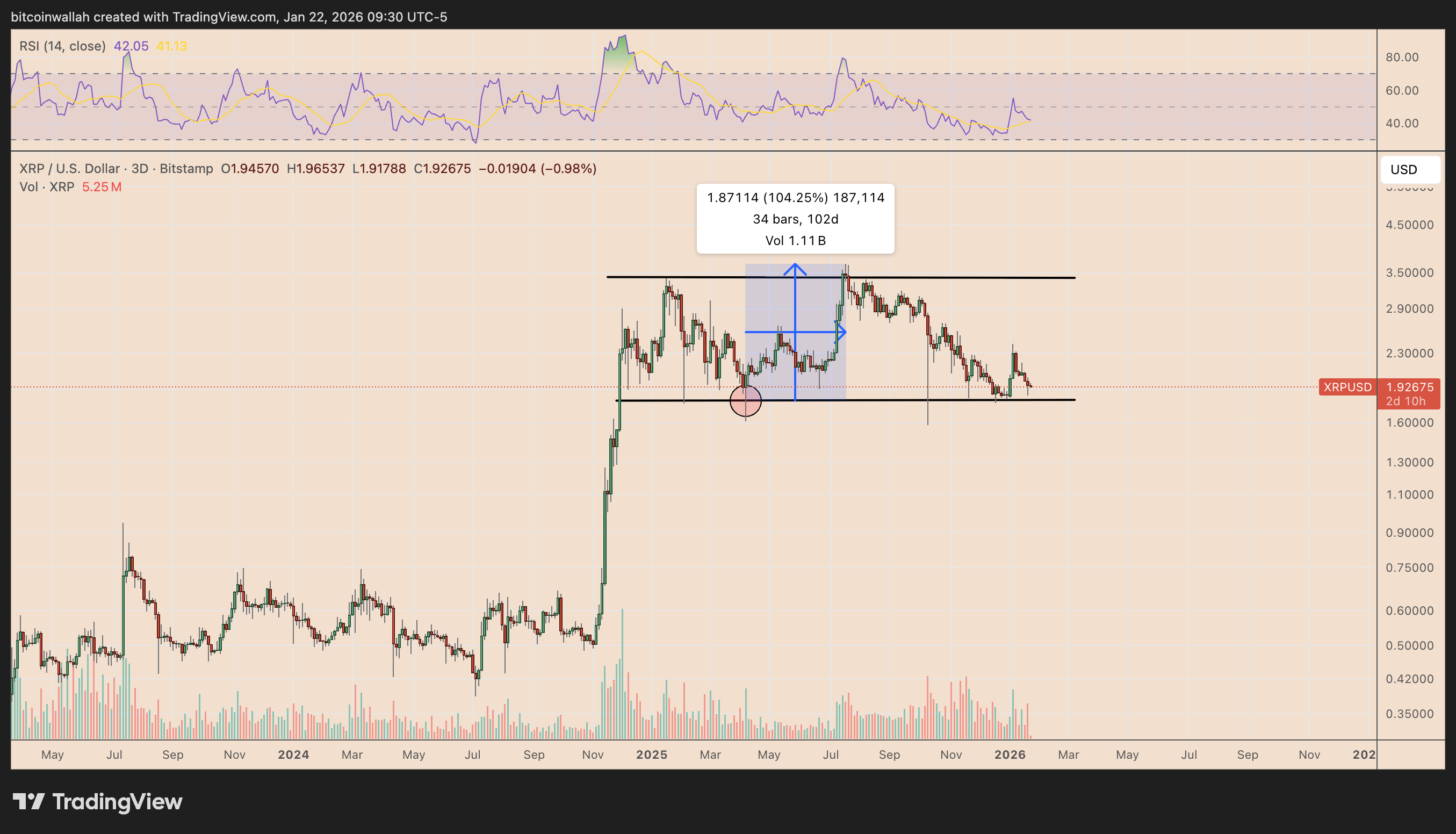 截至1月数据显示,XRP在测试长达一年的横盘通道下轨趋势线后出现温和反弹,该区域与1.80-2.00美元支撑带高度重合。值得注意的是,该区域正是2025年4月推动价格向3.66美元飙升100%的起跳平台。