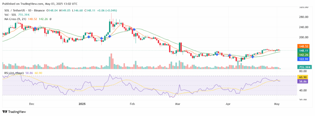 截至发稿时,Solana价格上涨0.87%,至146.83美元。在早盘交易中,该代币曾突破150美元关口,攀升至151.73美元。许多投资者预计随着市场情绪转为看涨,价格将进一步跃升至180美元。然而,SOL随后出现了回调。